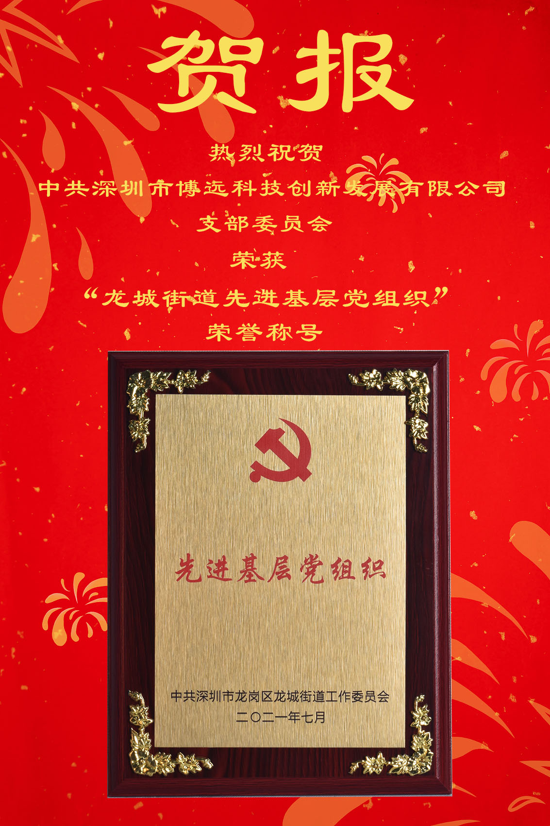 • 熱烈祝賀中共深圳市博遠科技創新發展有限公司支部委員會榮獲“龍城街道先進基層黨組織”榮譽稱號